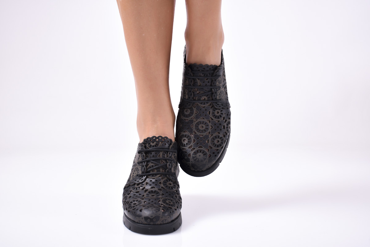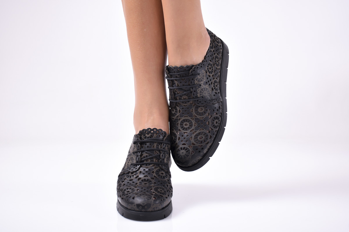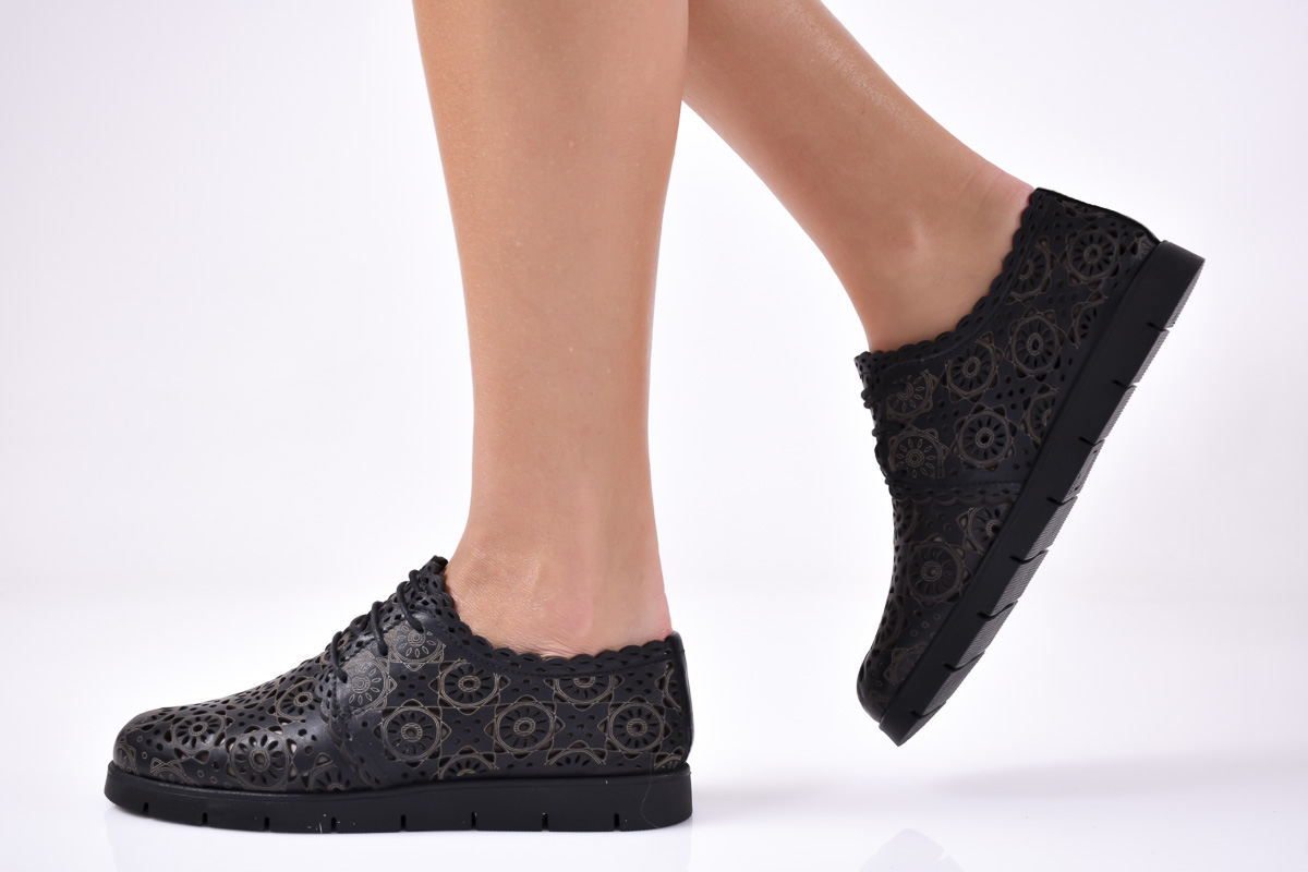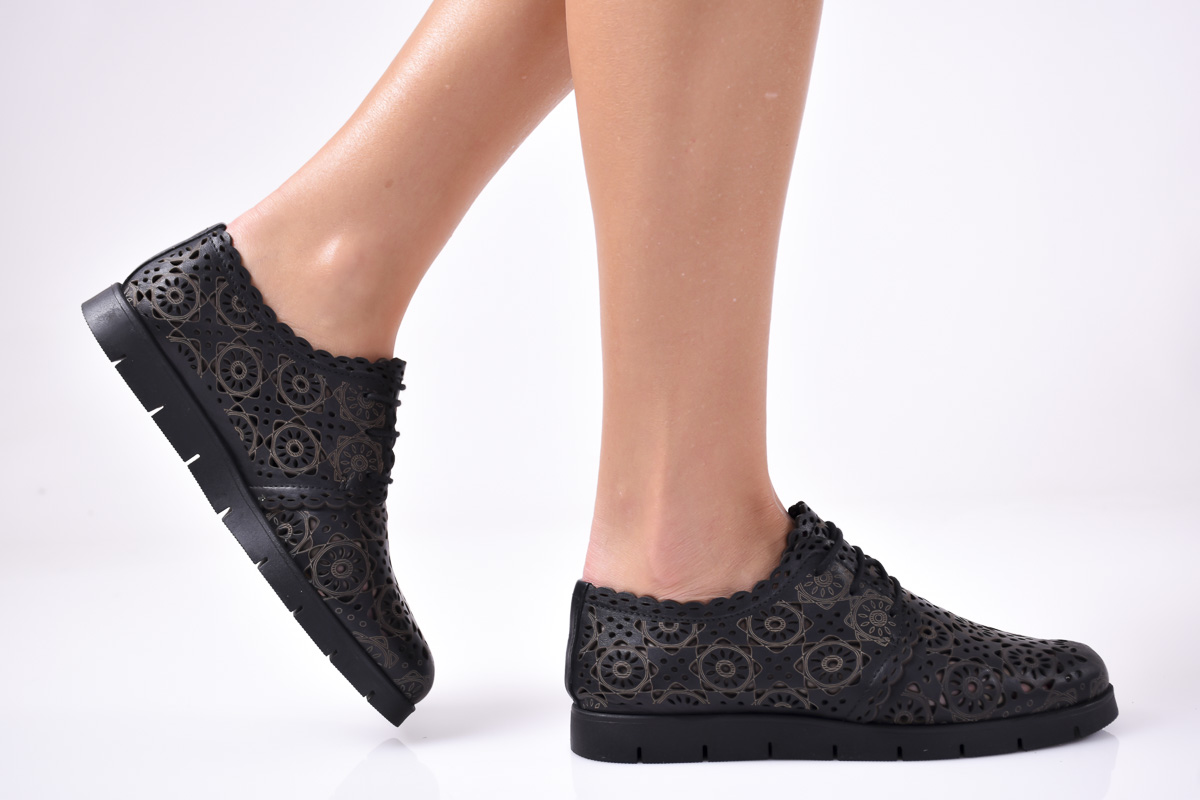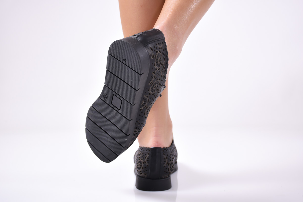 Дамски равни обувки,изработени изцяло от естествена кожа. Цвят:Черен Височина на подметката отзад: 1.5см Височина на подметката отпред;2.5см Височина на модела от петата до горе;6см Номерация;36-40 Дължина на стелка в сантиметри. Както следва: №36/23.5см. №37/24см. №38/24.5см. №39/25см. №40/25.5см.