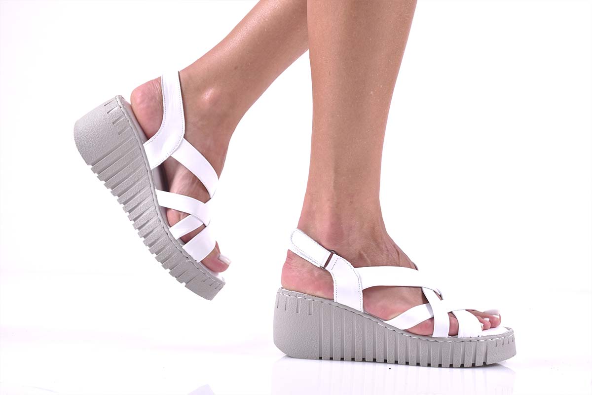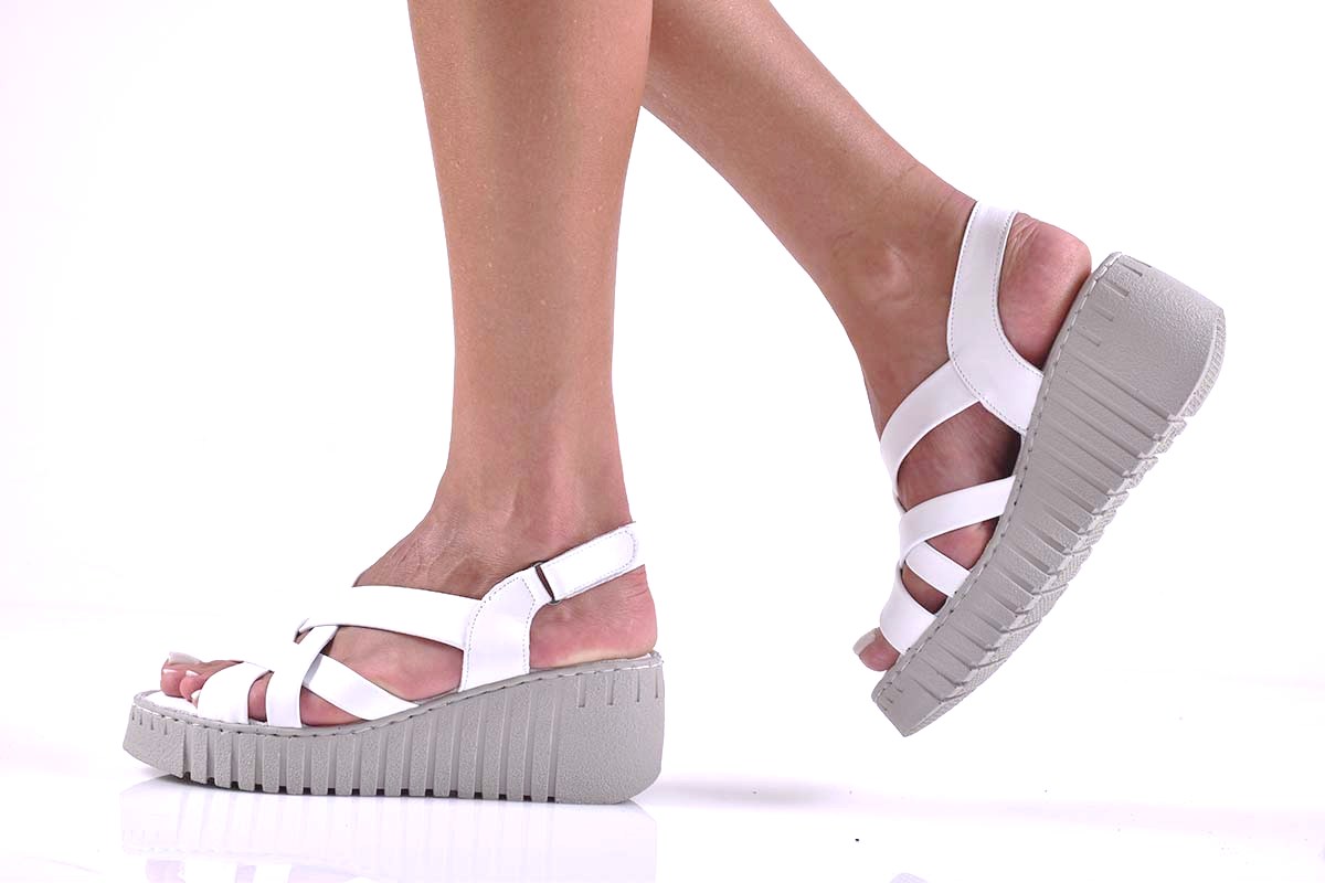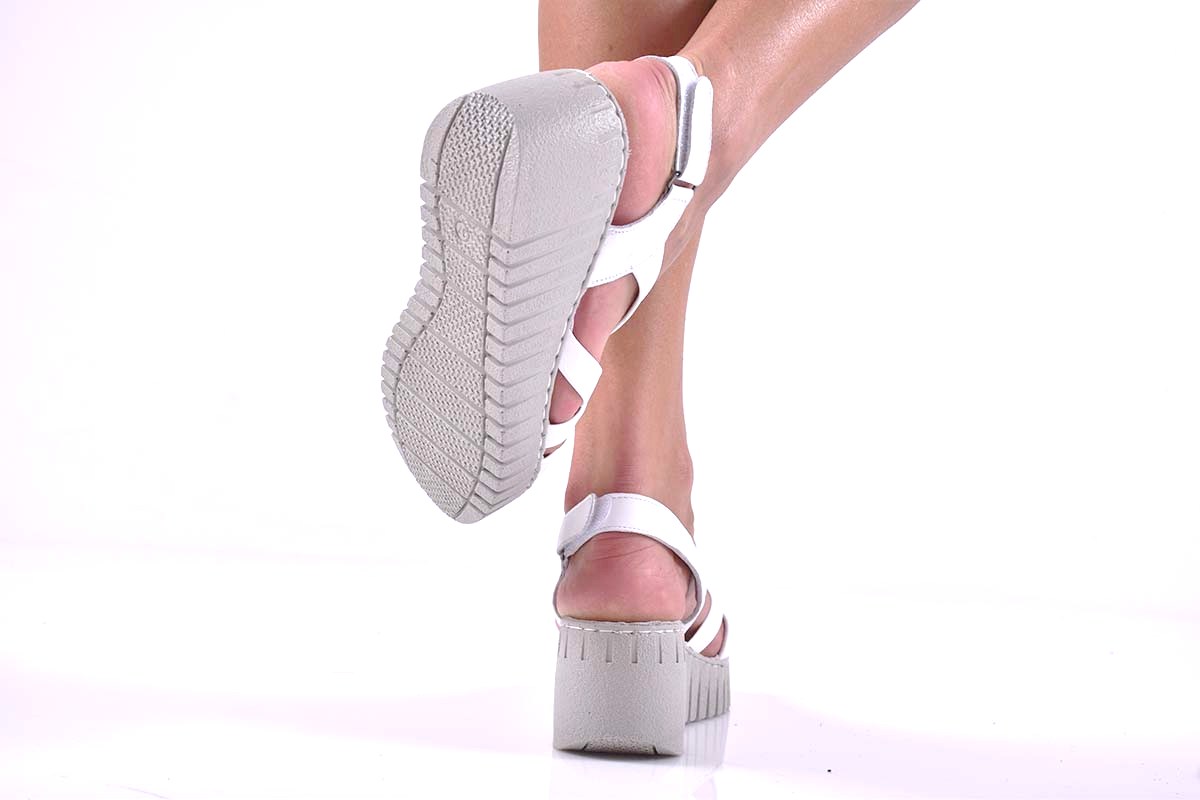 Имаме удоволствието да Ви представим нов модел дамски сандали на платформа EOBUVKIBG 502-6818 изработени изцяло от естествена кожа. Стелката е мека анатомична и комфортна,изработена изцяло от естествена кожа. Вътрешна част – естествен кожен хастар. Ортопедична стелка от естествена кожа е гарант за мекота и оптимална опора за свода на стъпалото, поддържайки го в правилната позиция при продължително ходене. Модела е решен с каишка за улесняване на обуването.Характеристика: Материал:Естествена кожа.Височина на платформата отпред 2,5 см. Височина на платформата отзад; 6,5 см. Цвят;Бял. Номерация:36-40.Тегло на модела 37 размер : 264 грама.Моделът е стандартен и отговаря на размерите.