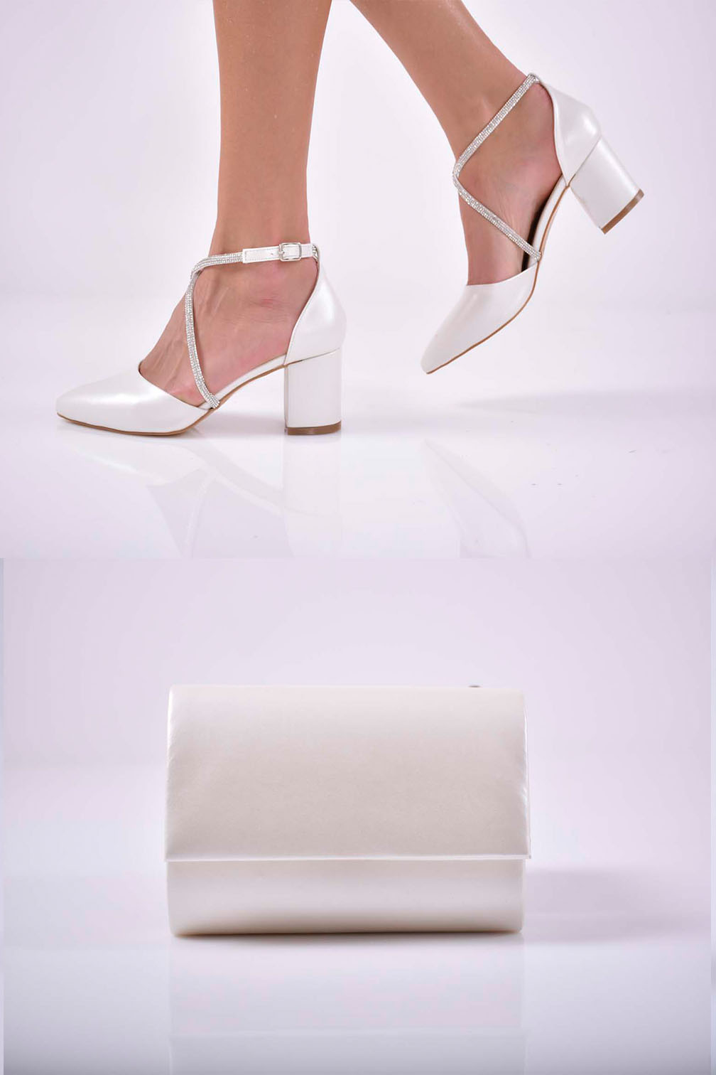 Имаме удоволствието да Ви представим комплект чанта и сандал EOBUVKIBG 502-5878 в бял цвят.Комплекта е подходящ за официален повод и събития като абитуриентски бал, сватба или вечерен повод. Чантата разполага с дълга дръжка и е с едно отделение и магнитно закопчаване . Характеристика:Височина на чантата: 11 см. Ширина на чантата: 18 см. Цвят: Бял. Kаталожен номер на чантата: 502-3654. Kаталожен номер на сандала: 502-3815. Характеристикa:. Височина на ходилото в предната част: 0,5 см.Височина на тока 6 см. Цвят; Бял. Номерация:35-40, Моделът е стандартен и отговаря на размерите.