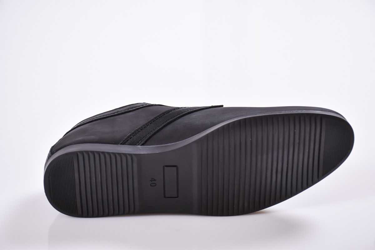 Български мъжки обувки изработени от висококачествен естествен набук и естествен хастар, предпазващ от влага и неприятна миризма. Ходилото е с отлични качества на гъвкавост и еластичност, което е гарант за удобство при продължително носене . Налице са връзки при свода, които регулират ширината му и улесняват обуването . Анатомичната кожена стелка осигурява естествена мекота и оптимална опора за свода на стъпалото , поддържайки го в правилната позиция при много часова работа.Цвят:Черен Номерация:41-45