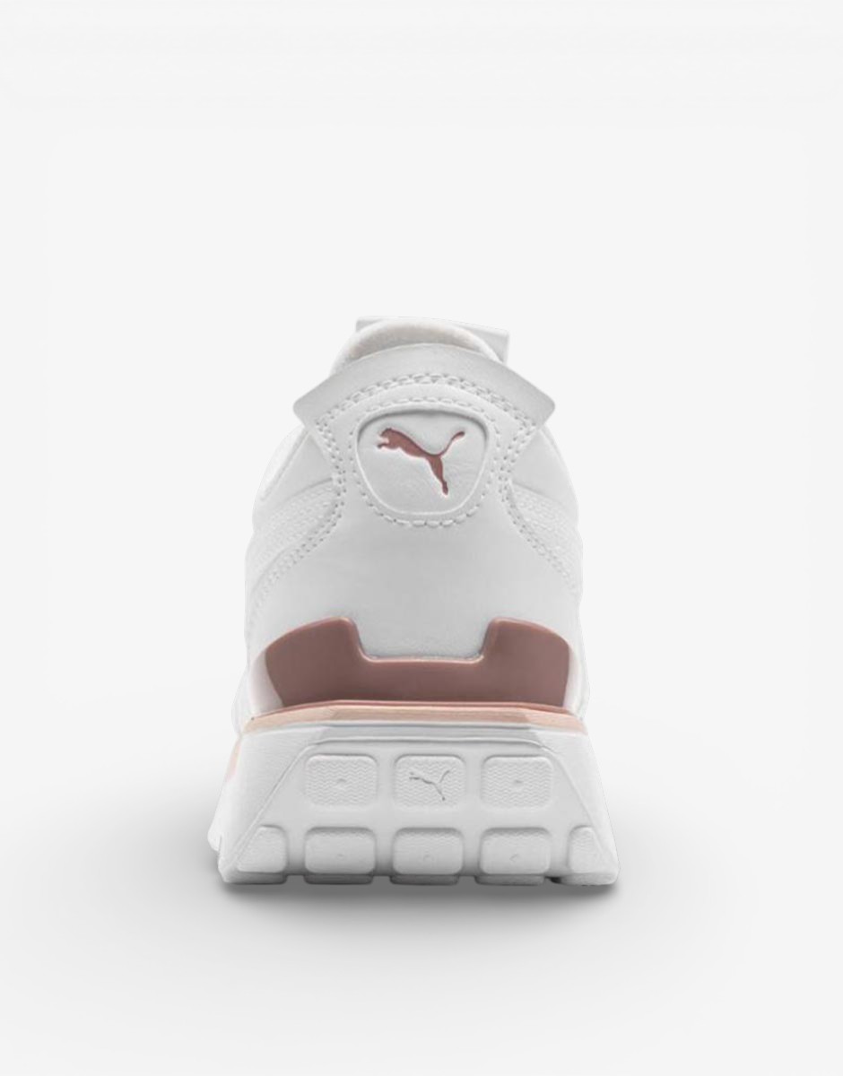Страхотни дамски маратонки PUMA в бял цвят, изработени от висококачествени материали. Комбинацията от различни материи в горната част ги прави неустоими и супер удобни. Текстил и еко кожа са съчетани, за да гарантират едновременно стабилност и добра вентилация. В oбемната подметка е добавена IMEVA пяна. Тя създава приятно, меко усещане, редуцира напрежението и възвръща енергията, отдадена при движение.. Перфектно се съчетава с дънки, рокля или спортно облекло и е подходяща за ежедневието или градски разходки.