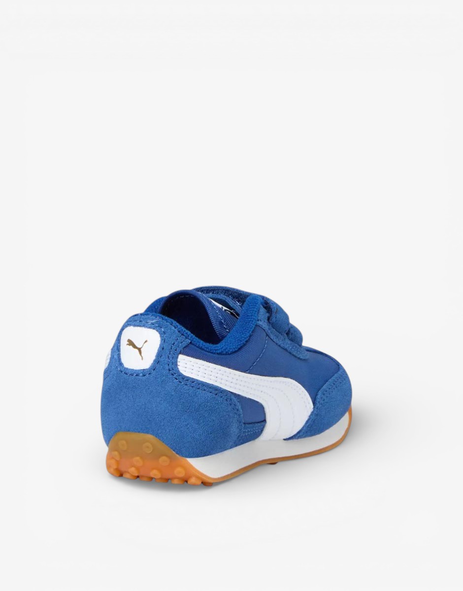 Страхотни детски маратонки PUMA в син цвят, изработени от висококачествени материали. PUMA Easy Rider се заражда в края на 70-те години, когато бягането се премества от пистата на улицата. Днес те се завръщат, с класическия си тесен профил и винтидж визия. С текстилна горна част, велурени наслагвания и закопчаване с велкро, тази детска версия със сигурност ще добави забавен, ретро щрих към всеки тоалет, който изберете за тях. Перфектно се съчетава с дънки, рокля или спортно облекло и е подходяща за ежедневието или градски разходки.